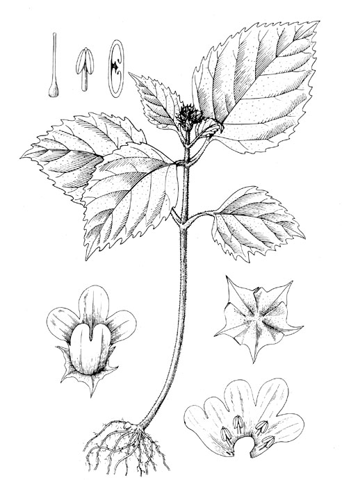 Description: Perennial, terrestrial herbs, shortly rhizomatous. Stem caulescent, erect, with two or three nodes, unbranched. Leaves opposite, petiolate, slightly unequal in a pair, lamina ovate, margin coarsely serrate, pinnately veined. Cyme (pseudo-)terminal, stalked, few-flowered; bracteoles absent, flowers pedicellate. Sepals connate in lower half, plicate. Corolla white; tube short, broad, saccate at base; limb slightly shorter than tube, bilabiate, upper lip with two, lower lip with three rounded lobes. Nectary annular. Stamens 4, included, adnate to corolla base; filaments subulate; thecae divergent, nearly parallel, not confluent, connective projecting apically, dehiscence longicidal; staminode present. Ovary depressed globose, glabrous, unilocular, placentae parietal, ovary locule; style slender, c. 4x longer than ovary; stigma depressed globose. Fruit unknown.